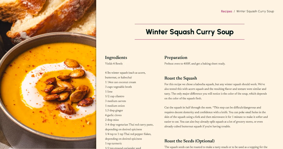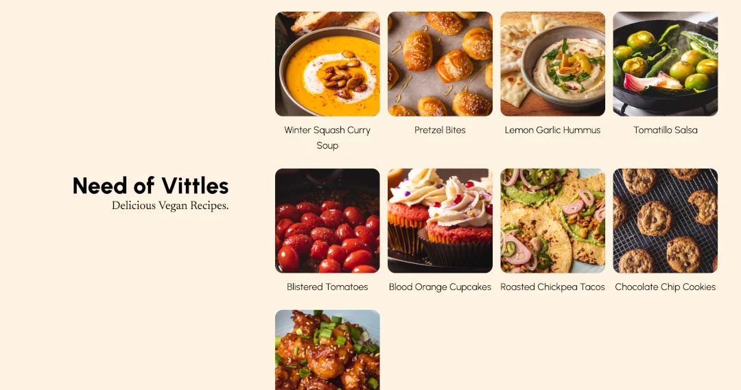 Need of Vittles is a vegan recipe blog with a unique cookbook-inspired widescreen layout. I designed it to keep a full bleed photo of the final meal always visible to readers so they never stop anticipating that first bite.