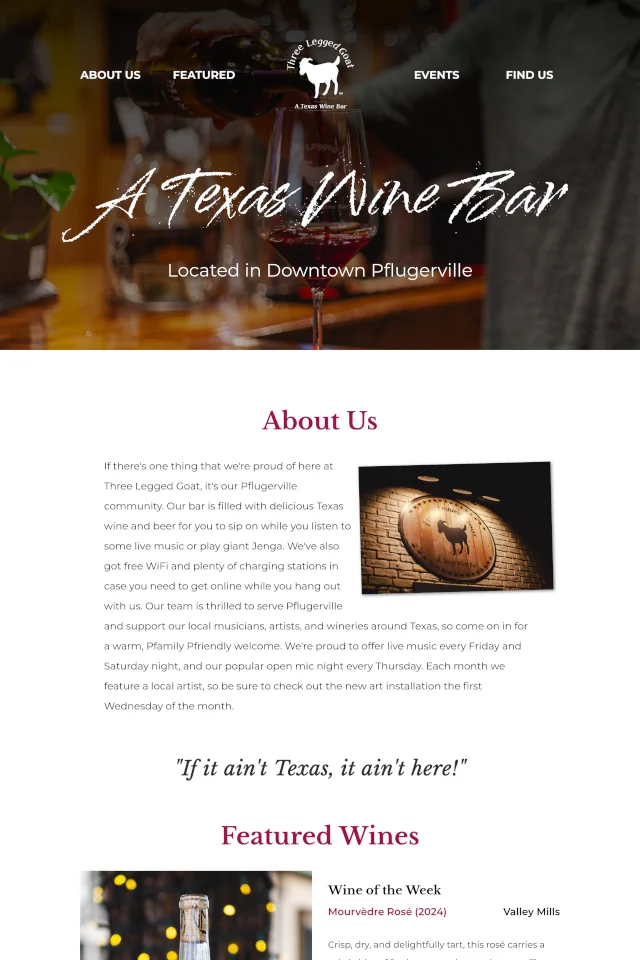 Three Legged Goat is a Texas wine bar with a laid back vibe and rustic aesthetic. I designed their site to match that look and feel while also showcasing their wide selection of local Texas wine.